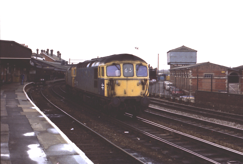 33101 and 33117 leave Salisbury with the 1150 Waterloo service on Nov 22nd 1986