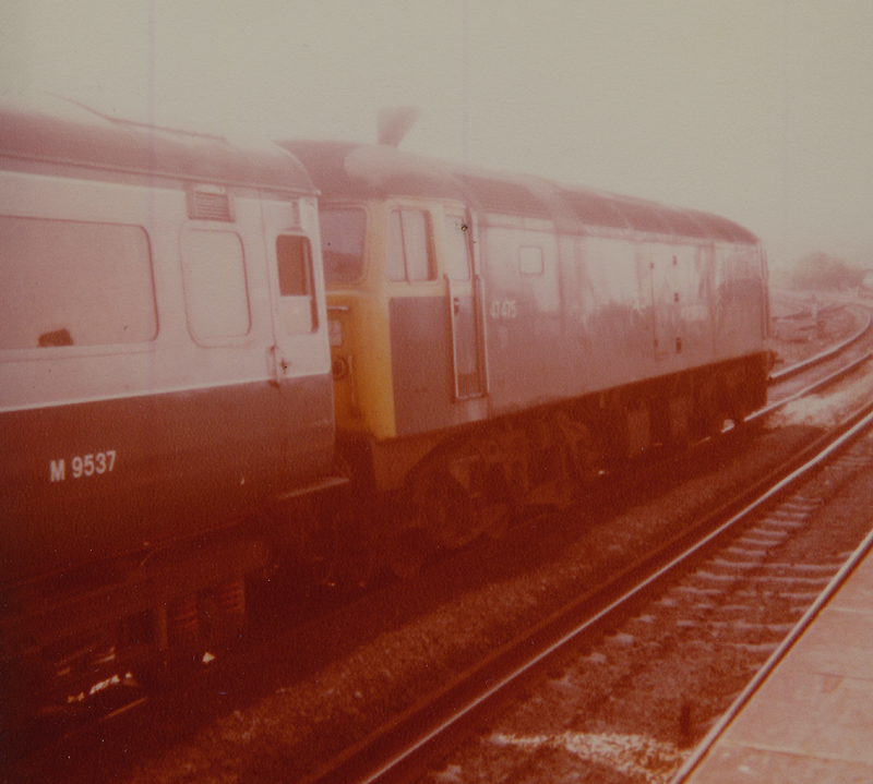 47475 into the sun at the Jn with the 1418 Crewe – Holyhead on 050981.