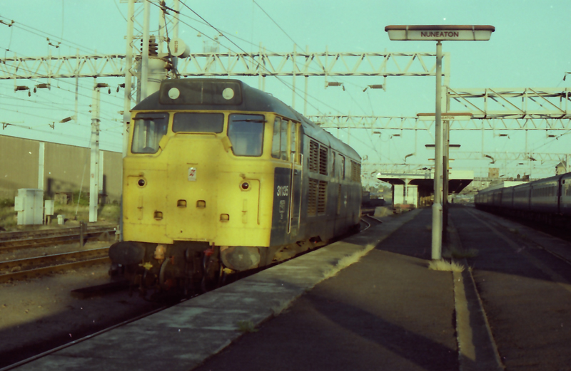 Long evening shadows at Nuneaton as Hymek styled cab 31135 is stabled on July 28th 1984