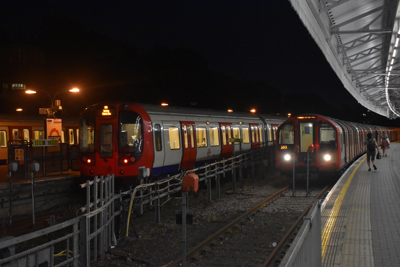 Tube stock of varying guages at Ealing Broadway on August 1st 2022