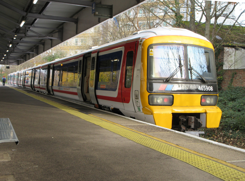 Looking superb in partial sun, retro NSE liveried 465908 at sleepy Bromley North with the 1212 to Grove Park on December 8th 2025