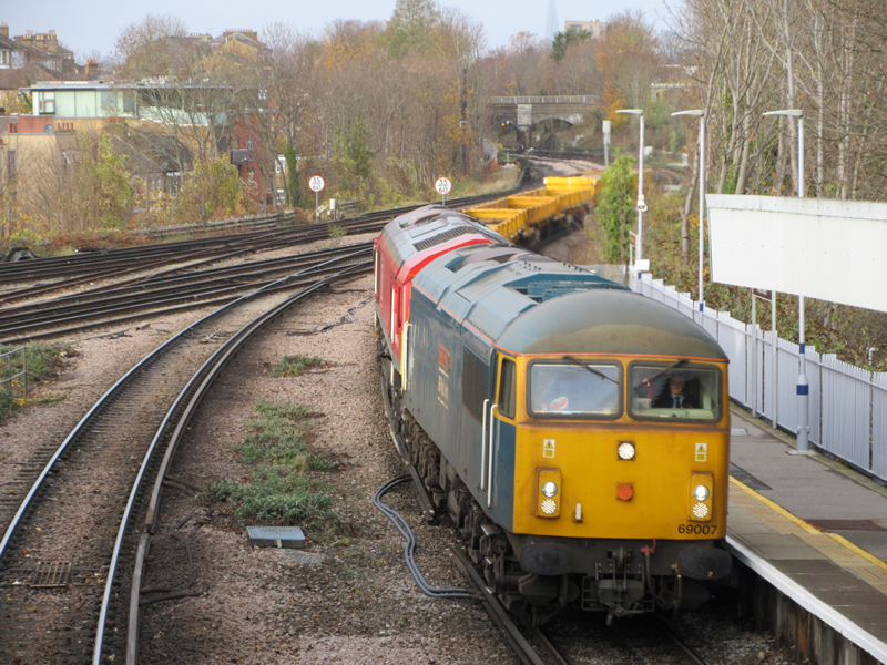 An entertaining pre “down Midnight” bash saw much of the Travelcard area of South Eastern toured. Heres 69007 and 66061(dit) on 6Y48 Eastleigh – Hoo Jn at Hither Green on December 8th 2025