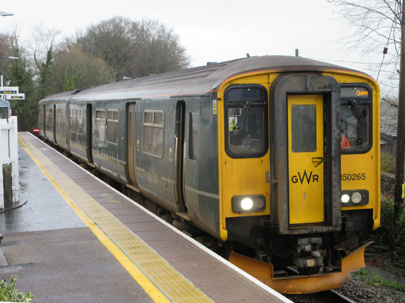 The Gunnislake branch is even more spectacular in winter as the bare trees dont obscure Tamar Valley views, in wet weather 150265 awaits departure with the 1320 Gunnislake – Plymouth on December 9th 2025