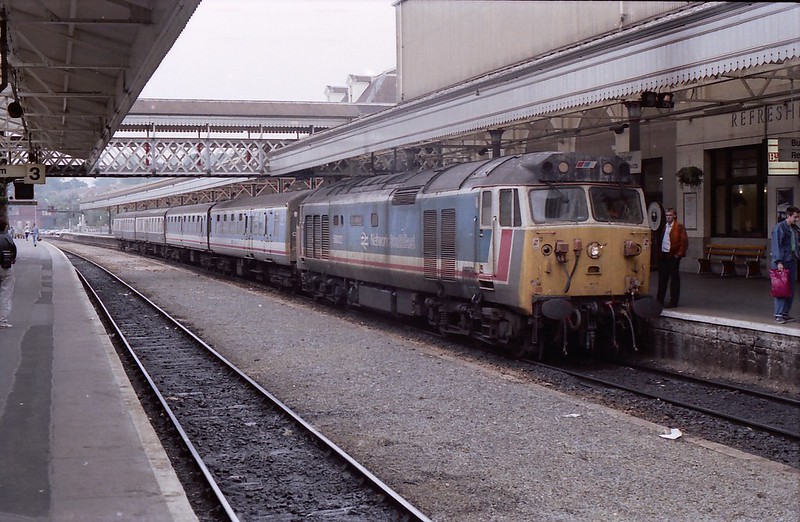 By this time a restricted engineers loco, 50032 has been borrowed to work the scratch set forming the 1402 Barnstaple – Exeter SD on September 15th 1990.