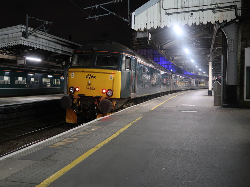 A few days out West with Monday 3rd June ‘s “down Midnight” a good start with 57603 atop proper sleeper stock in the form of coaches 17104, 12100, 10225, 10601, 10532, 10534, 10596, 10563 and 57602 tailing to Reading,