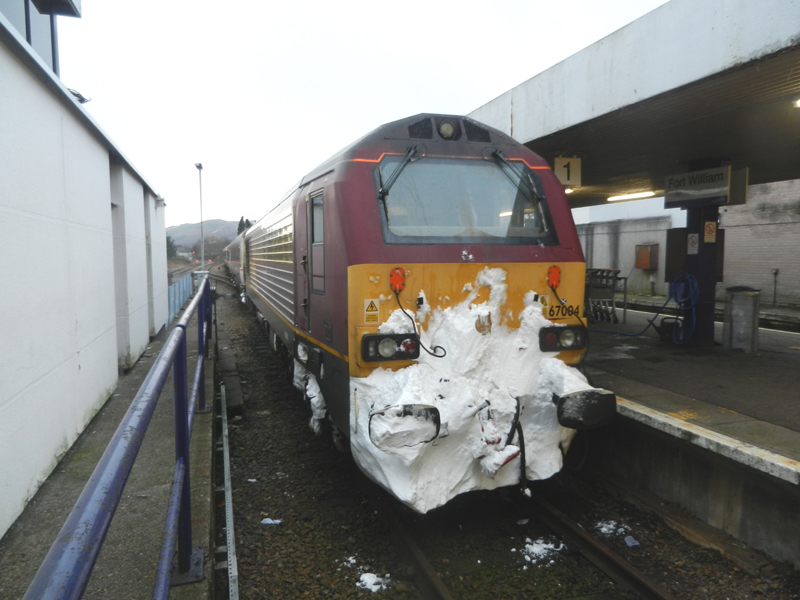 The snow was thick over Rannoch and 67004 has brought a good bit off the hills into a snow free Fort William with 1S25 on January 22nd 2013