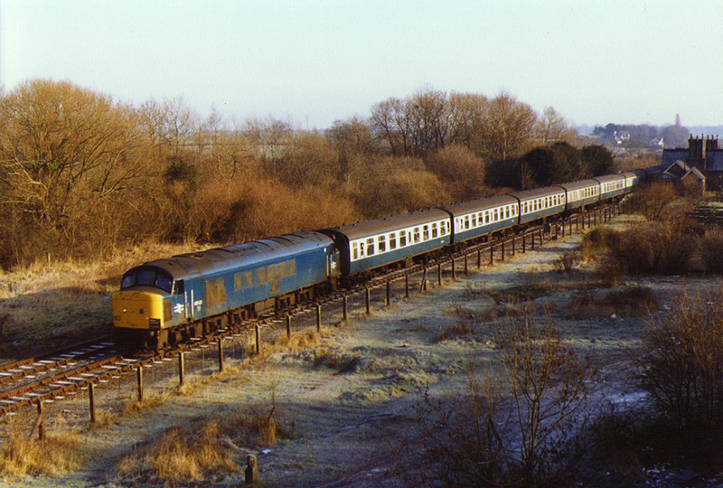 Ian Windmill’s excellent phot of 45121 heading West through Winslow on the Bletchley – Oxford line with the “Mendip Artificer” tour on January 21st 1984