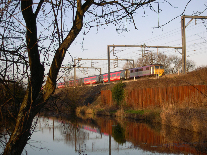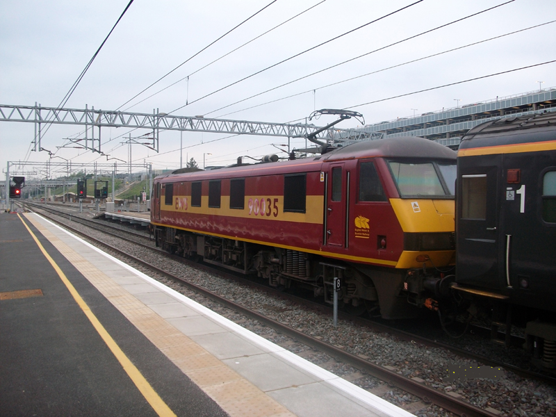 Guy Kendrick captures 90035 and Mk IIIs on a late afternoon Birmingham – Euston (vice Pendo) turn at Milton Keynes on May 13th 2009