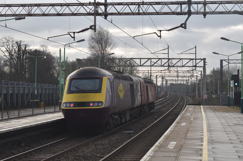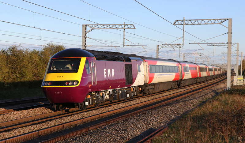 With the forthcoming termination of EMR HST operation on the MML in mid May, a taster of what could have been if HST’s were to continue in service with EMR. On her first day in traffic in EMR livery, 43274 passes Oakley on 14 April 2021 heading away from camera on the 1B69 1745 Nottingham – St Pancras International. Thanks to Mark Beal for the photo