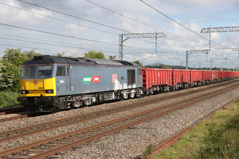 A week later and a very lucky patch of sun catches 60074 passing Oakley on May 15th 2021 with 6H70 1633 Luton Limbury Road – Peak Forest. A Mark Beal photo recvd with thanks