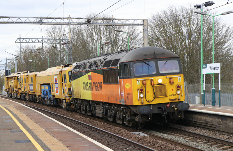 With track machines 73110 + 77908 in tow, 56302 PECO The Railway Modeller 2016 70 Years passes Wolverton on 16 April with the 6Z58 1015 Guide Bridge – Dollands Moor. Thanks to Mark Beal for the photo