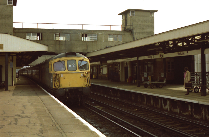 Classic route 62, 33116 at Woking with the 1010 Waterloo – Salisbury on April 19th 1986