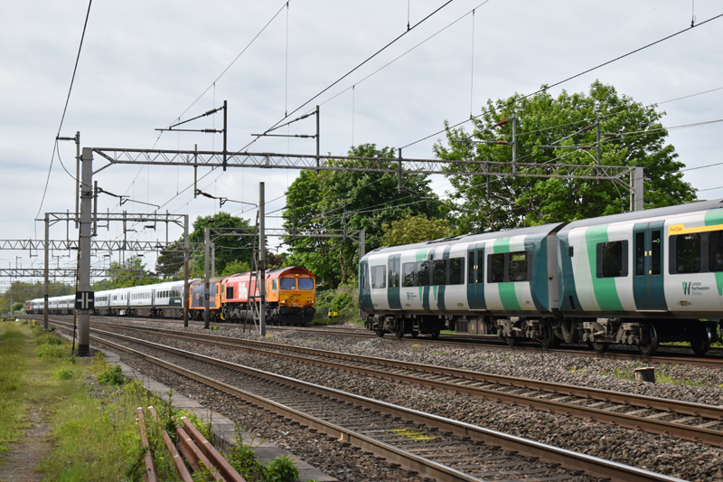 With an “Undesiro” unit doing its best to get in the way, a fast line run for 66783 with 73212 and 73213 topping a tailing 2 plastic pig units on a Bournemouth – Wolverton move on May 28th 2021