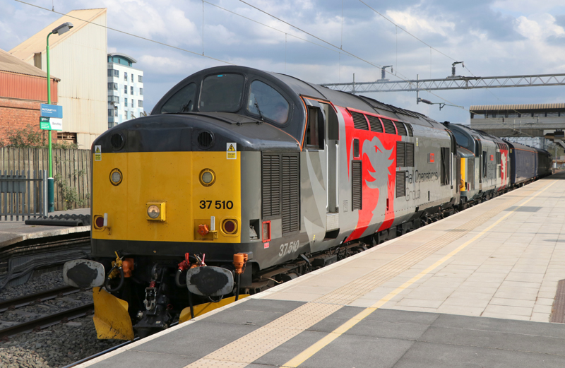 ROG threesome as 37510 Orion + 37611 Pegasus lead two ROG barriers departing Bletchley on 30 April 2021 on the 5M59 1634 Bletchley – Leicester LIP. Stablemate 37601 Perseus is on the rear. Thanks to Mark Beal for the photo