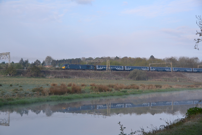 Not the most common 92 on sleeper duties 92006 is reflected on still, slightly misty canal waters with 1M16 2045 Inverness/Aberdeen – Euston “Caledonian Sleeper” on a frosty April 30th 2021
