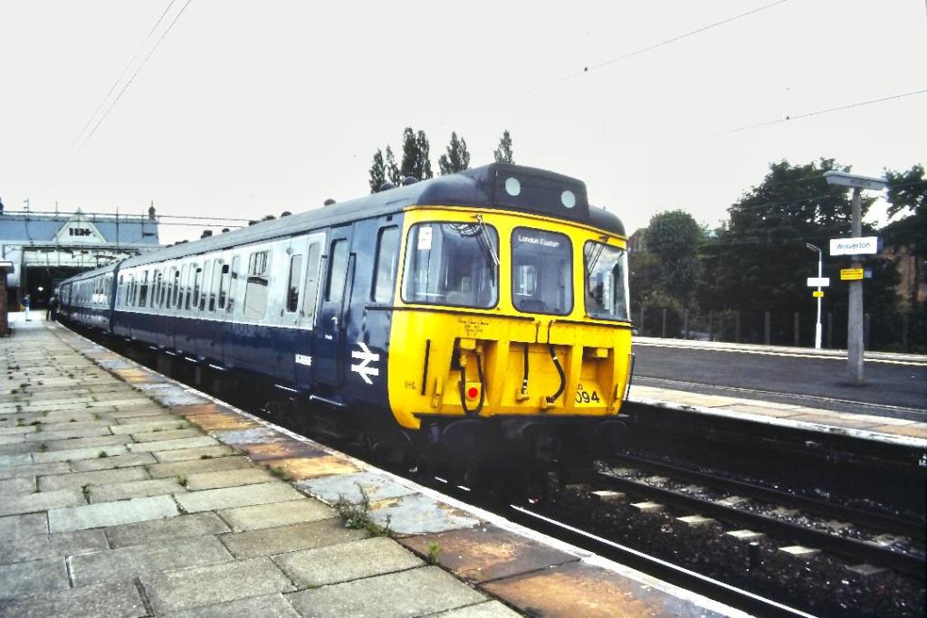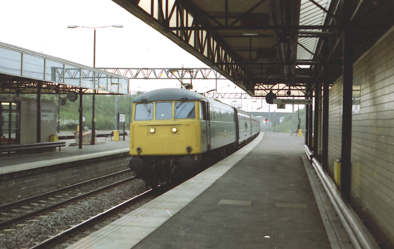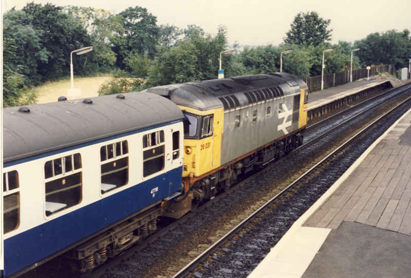 45123 returns North through Leighton after working an up Sunday morning drag with a 310 unit and the now removed station footbridge standing proud on November 10th 1985