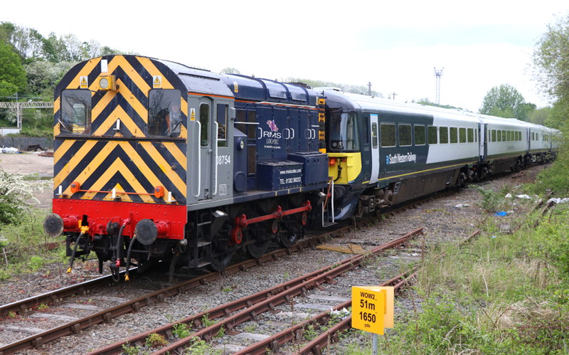Thanks to Mark Beal for this view of ex Inverness 08 08754 shunting redundant 2402 into the Works at Wolverton on May 28th 2021