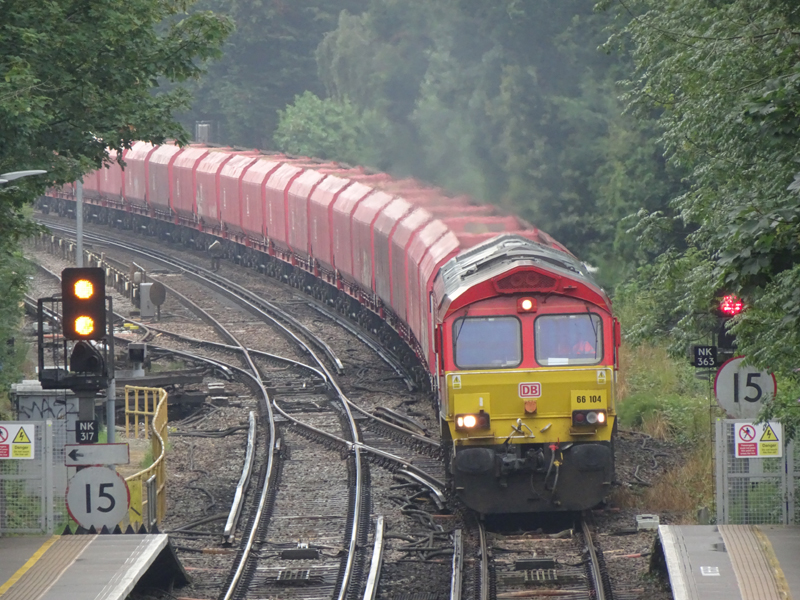 66104 looking very smart with red liveried sand hoppers from Angerstein to Hither Green approach Sidcup on July 24th 2021