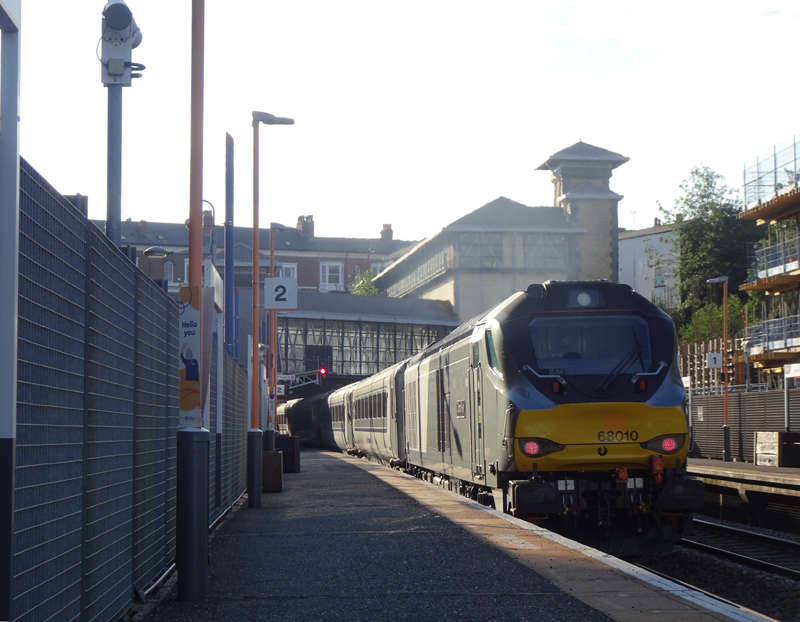 The Chiltern loco hauled set still serve “shacks”, here 68010 powers away after making the booked stop at Jewellry Quarter with the 0716 Stourbridge Jn – Marylebone on August 11th 2021