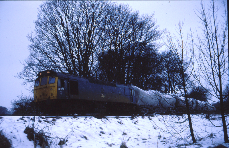 the late Tony Ewer catches 25279 in the snow at Dunstable with the return cement empties to Northfleet on February 19th 1986