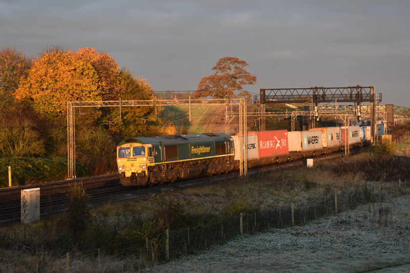 Lovely soft light, Autumn colours and frost create a nice scene for 66556 passing on 4L89 Up Scotch liners on November 16th 2021