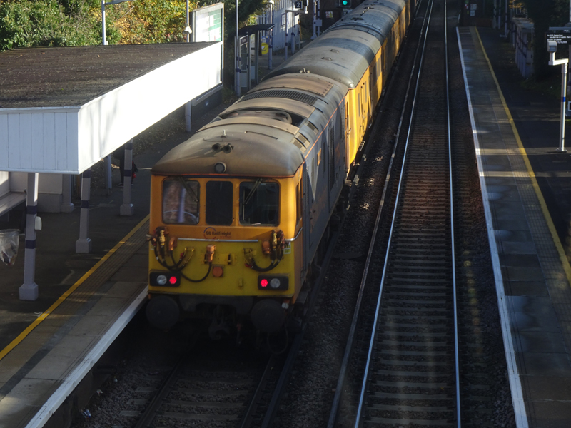 73964 tails a Tonbridge – Gillingham Network Rail test train through New Eltham on November 17th 2021