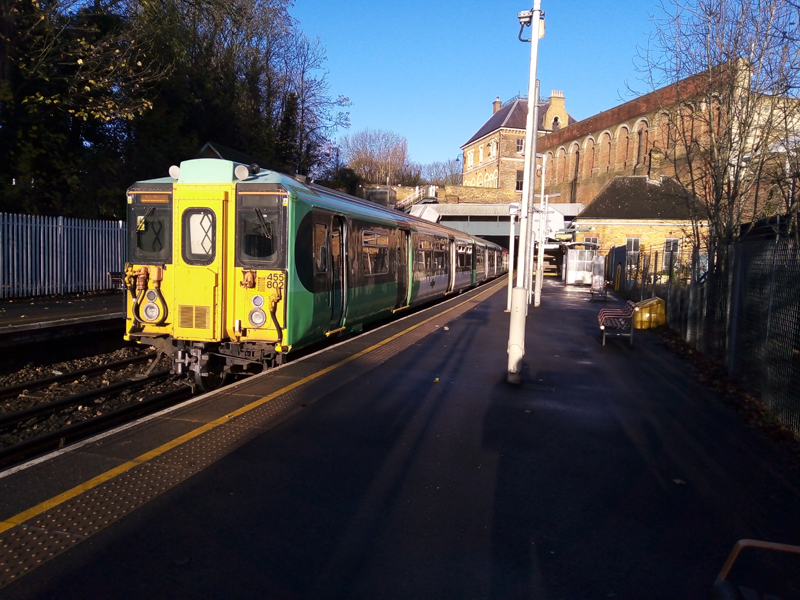What must rate as South London’s finest station with its junctions and old buildings Crystal Palace sees “swamp unit” 455802 arriving on a London Bridge – Beckenham Jn working on December 4th 2021