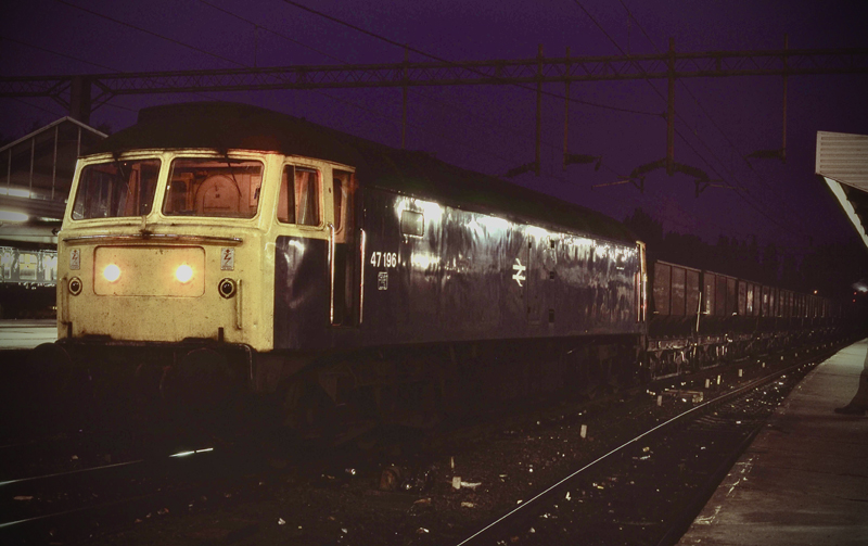 The “Peak Forest – Bletchley ” stone flow as captured by Steve Chapman hasa long hisory with 47196 at Northampton on September 26th 1985