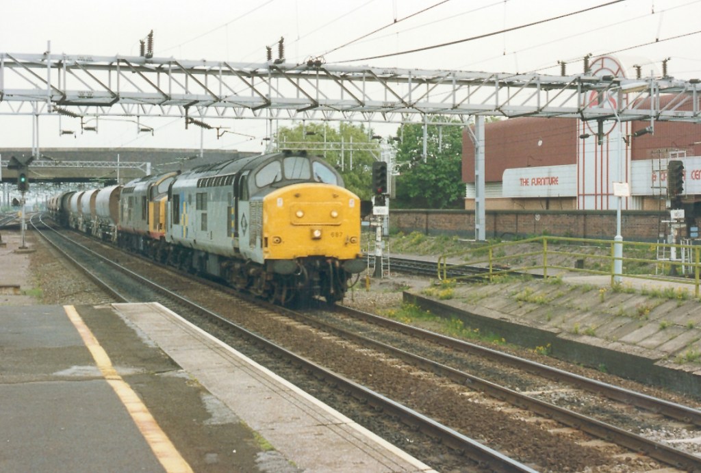 Booked power in 1990 sees 37687 and 37676 power through Nuneaton with the Bletchley – Peak Forest stone empties on May 12th 1990
