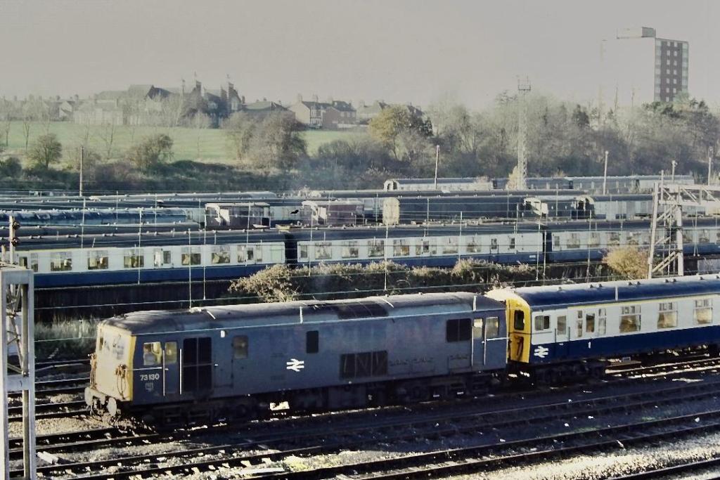 A very rare Wolverton visitor caught by Steve Chapman with 73130 awaiting a return from Wolverton Works dragging a Southern unit after attention in October 85