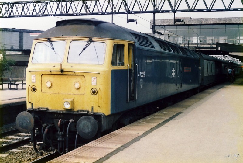 47222 “Appleby-Frodingham” at Stafford on Sunday August 26th’s 1984 1140 Manchester – Gatwick was a very rare working for this Immingham based class 47. This Eastern loco is clean unlike most of her grubby Midland class mates.