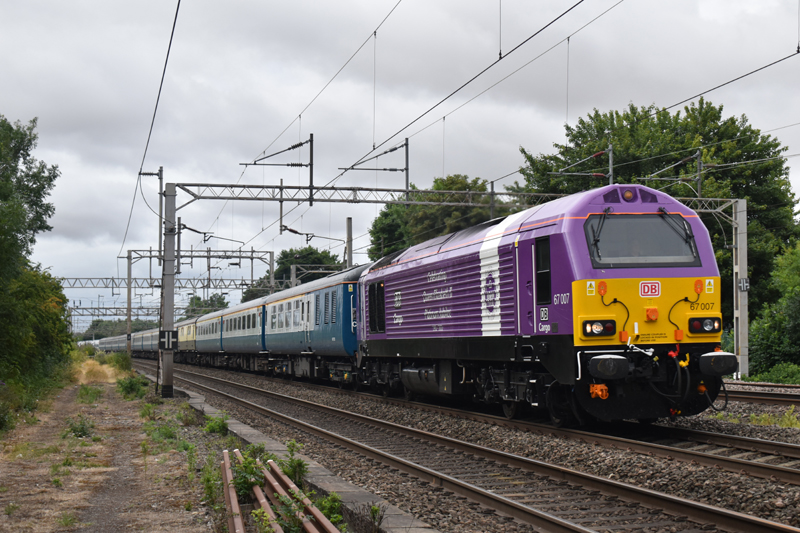 Looking and sounding good 67007 approaches Leighton with Wembley – Burton emcars on July 25th 2022