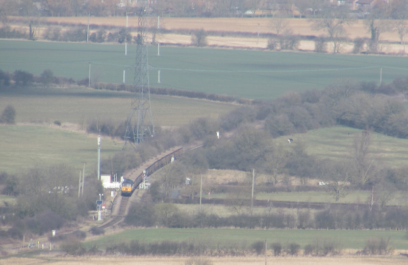 Viewed from distant hills 56301 crosses Marsh Crossing South of Aylesbury with spoil empties from Calvert on February 27th 2015