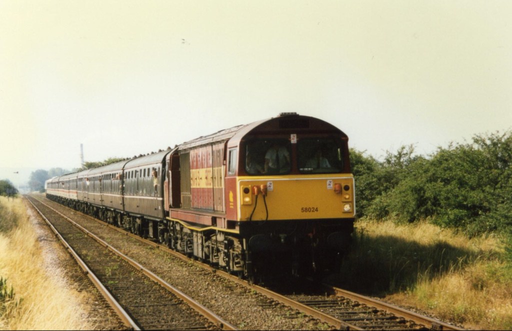 Hertfordshire Railtours “Spin Doctor” saw 58024 working from London Victoria down the WCML to Bletchley then down the branch to Bedford for “peds” forward to Stratford-on-Avon. TC photted the tour approaching Kempston Hardwick below