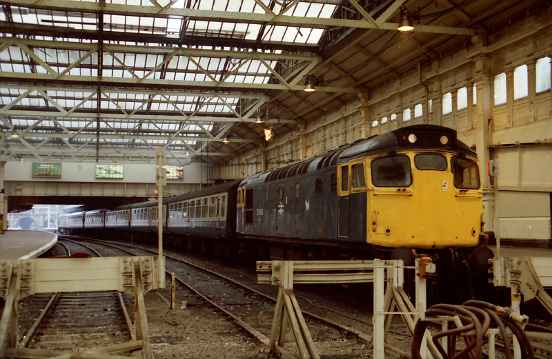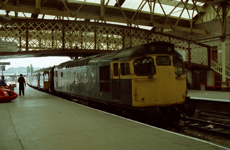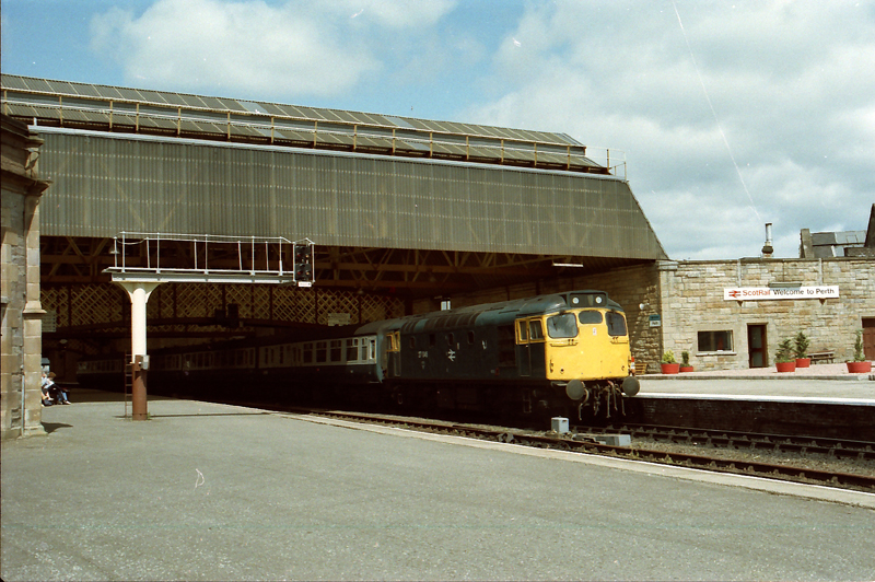 The impressive overall roof at Perth station with 27046 chattering away prior to departure with the 1350 Perth – Glasgow QS July 17th 1986