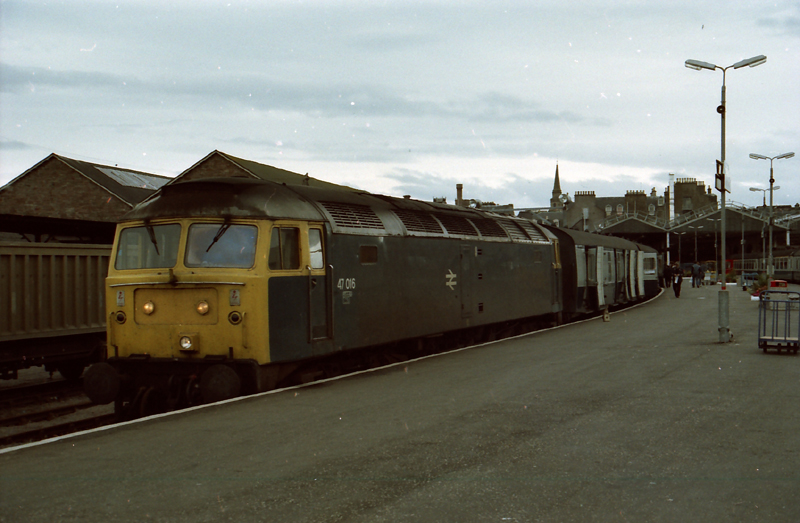 The leading BG doors are all open as 47016 waits departure time with the 1225 Inverness – Aberdeen on July 19th 1986