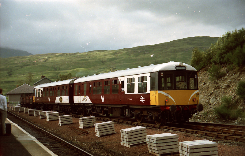 The “Mexican bean” class 104 DMU that was used on some Oban – Crianlarich shuttles seen here at Crianlarich on July 20th 1986