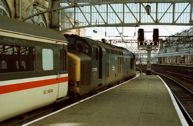 After working in on a Carlisle – Glasgow 37198 takes “emcars” out from Central to Polmadie on July 21st 1986