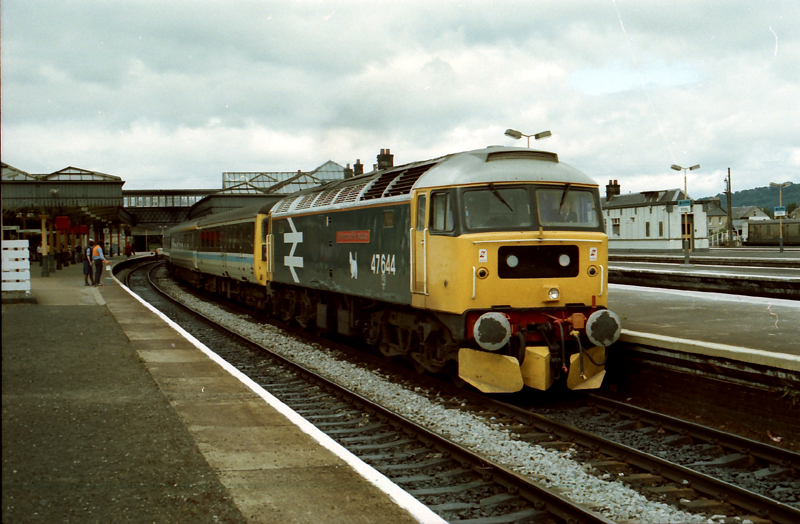 Looking the part on a push pull set 47644 rests at Stirling with the 1100 Aberdeen – Glasgow on July 25th 1986