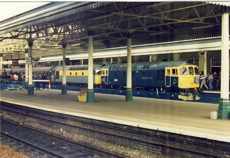The atmosphere aboard was lively as we headed through Herne Hill to join the main line at Wimbledon. Guildford, Havant and Eastleigh followed before joining the old Crompton stamping ground of Romsey to Bristol TM via the Avon valley. Some bellowing photographers on a still sunny Salisbury Plain raised a huge cheer but severe gloom during the 20 minute stop at Temple Meads with Bath Road depot now a weed infested “jungle”.