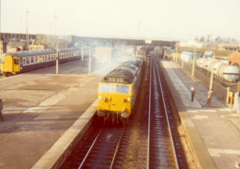 50030 on an up freight with a Swindon built DMU alongside at Severn Tunnel jn on 290177