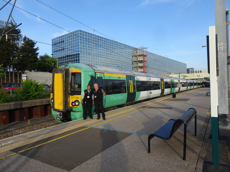 The train crew pose at Milton Keynes for the last time with the final 1710 East Croydon – M.Keynes on May 14th 2022, 377214 and 377201 doing the honours