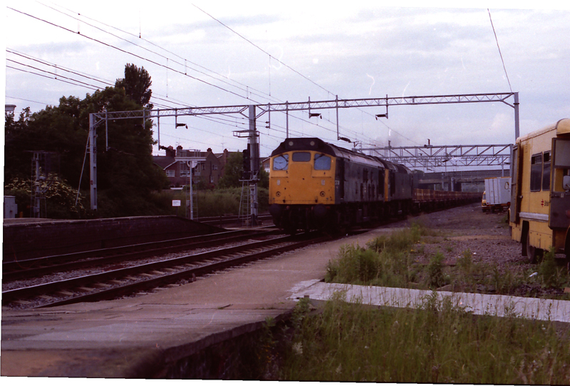 25236 and 25181 shatter the peace as they approach Leighton Buzzard station with PW vans looking on with 4E78 Forders – Kings X Goods on June 28th 1983