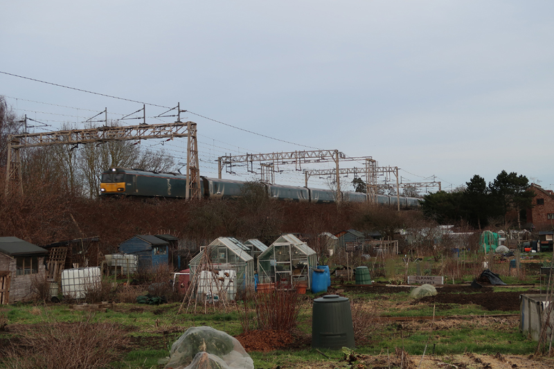 92014 heads South past Linslade allotments with 1M16 up sleeper about an hour down on on 030223