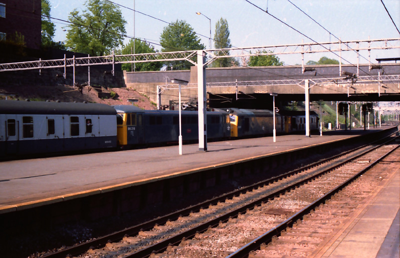 25072 and 25207 dragging 86218 at Coventry with the LNER Tour , the pan is now back up on the can and the rats are being uncoupled on May 13th 1984