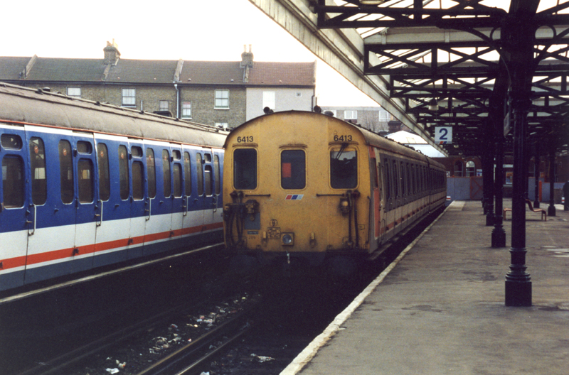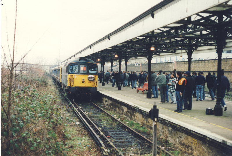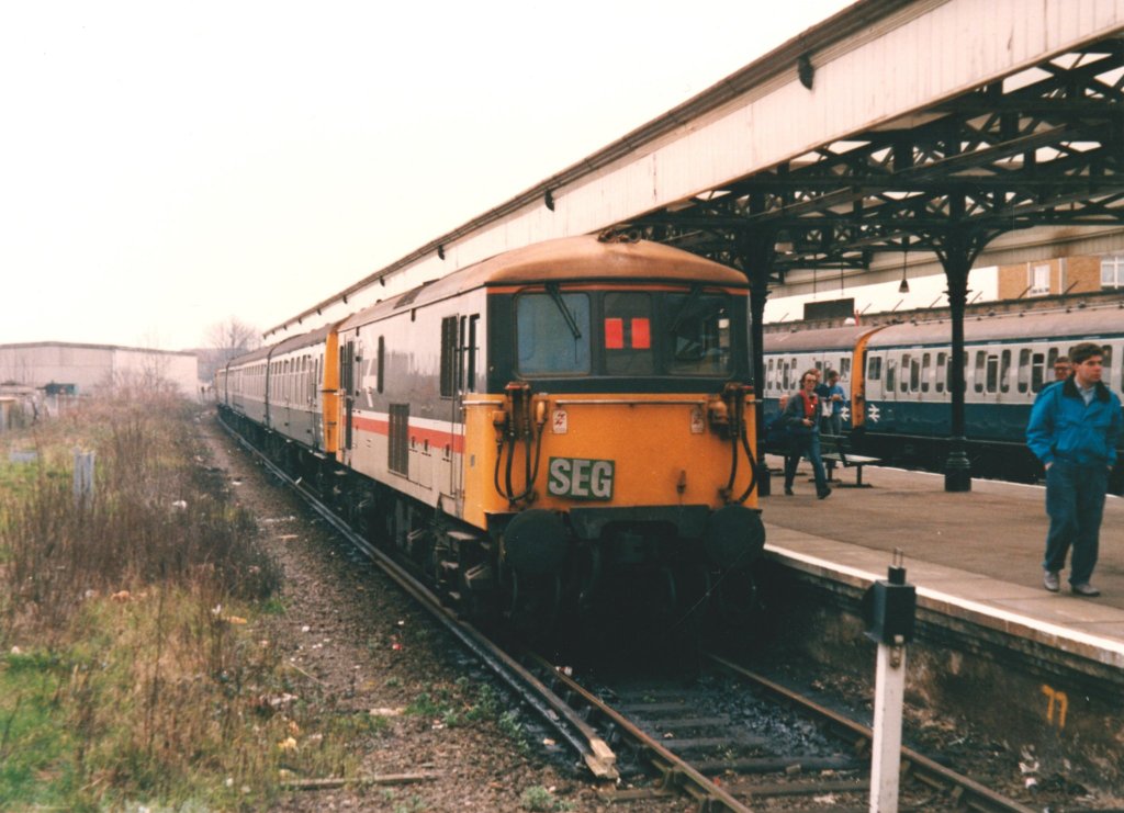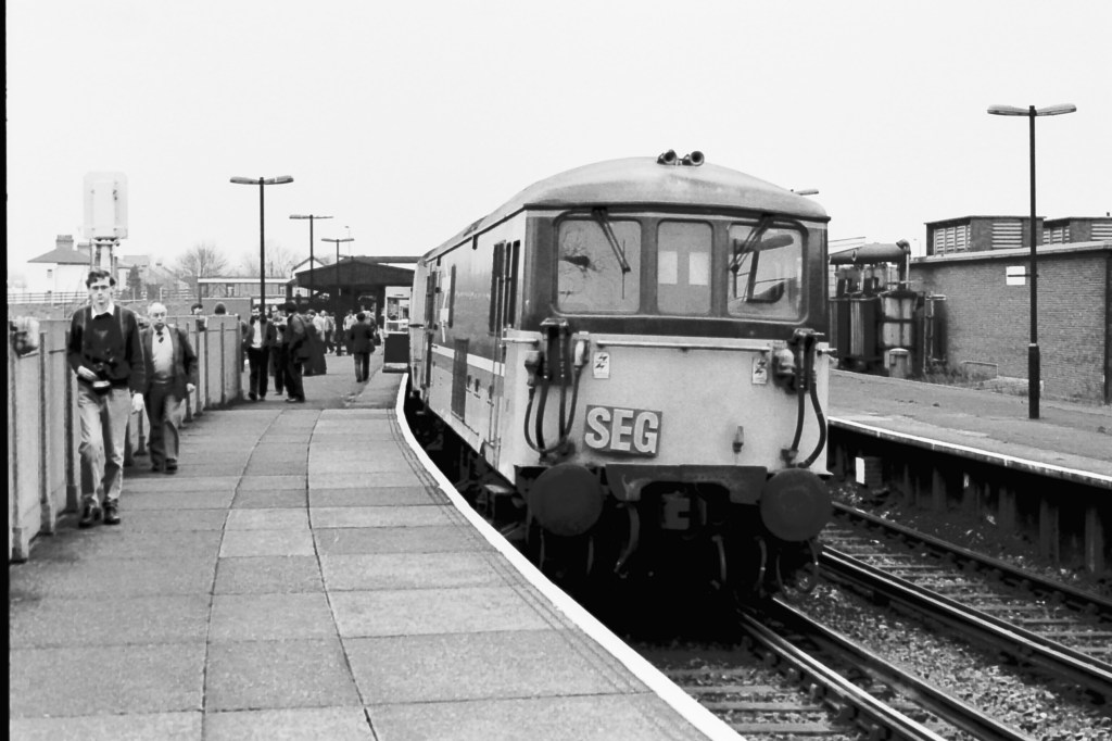 Dave Spencer’s phot of 73138 with 4TC’s 8104 and 8034 in tow with the Gyre and Gimble railtour on March 12th 1988. This tour covered much of the Southern London network and is seen here at Elmers End prior to a run down to Addiscombe.