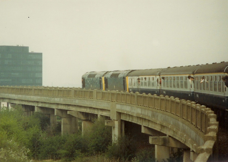 Trev Rolfe’s excellent phot of 25316 and 25321 climbing Bletchley flyover with the tour, 040584.