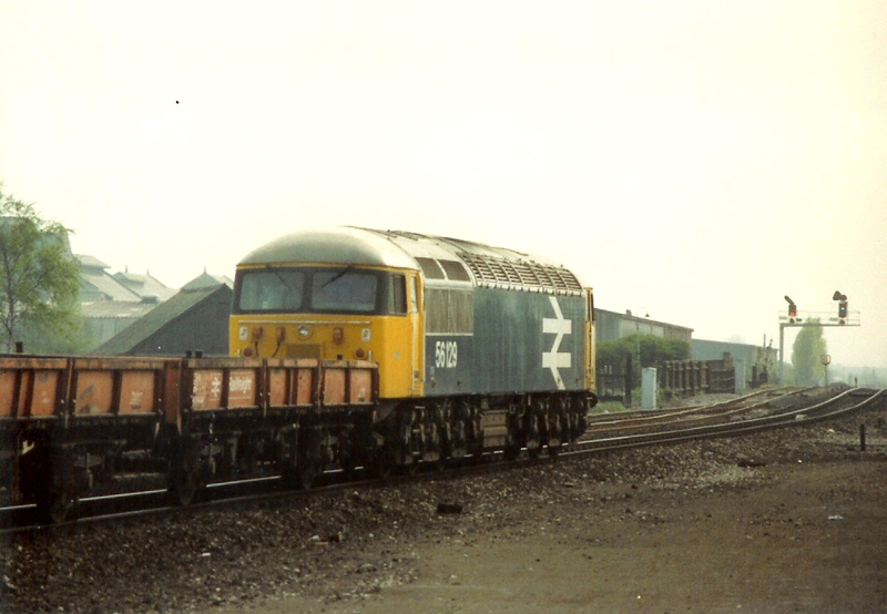 Trev Rolfe’s view of nearly new 56129 passes Burton with a short freight, 040584.