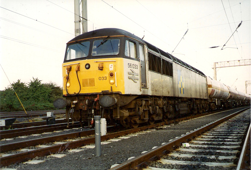 LWBK sector ( Cardiff Canton-Midland & North West Pool) Built August 1977 56 033 is seen at Wembley yard with a rake of these tanks, I seem to remember these were being moved for storage and had come into the yard to await a forward driver. A June 95 view from “RM”