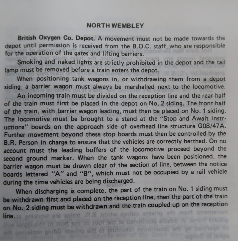 A small non rail served BOC depot remains at Wembley North but the main former BOC rail depot area is now a warehouse. The BOC facilities incl the unloading bays and holding tanks were demolished in Aug 88. Relic sections of the up service line between the old ground frames survive, as does, incredibly, a sign stating “electric trains no entry to BOC sidings” . The bufferstops at the North end of the headshunt also survive..